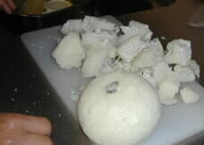 |    鏡餅は餅が固いことと「切る」という言葉を忌むた「開く」という縁起のよい言葉を使い、刃物で切らずに、手や槌(つち)で割って食べるのがしきたりだそうです。そこで夫は、金槌を使って固いお餅を割りました。 | |