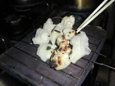 | 網の上で、先ほど細かく割ったお餅をこんがりと焼きました。 |  |