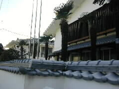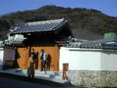 | プールの道を隔てて右側には、やはり白壁の中に瓦屋根の大きな建物、こちらは小学校の講堂です。入り口は元家老屋敷の立派な黒い武家門がデンとあります。 |  |