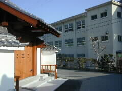 |    武家屋敷の黒い塀沿いに歩いて小学校の角を曲がると、まだ白壁の乾ききらぬ程に新しい大きな門がありました。ここは、小学校のプールの入り口です。右の写真を見ると、小学校だということがよく判ります。母の時代からあったという垣根のからたちが今も元気です。 | |