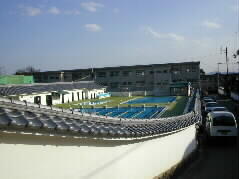 | その龍野城の裏門へ通じる登り坂から覗いてみました。本当にプールでした。向こうに小学校の校舎も見えていますね。 |  |