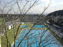 |  | 城壁の銃穴からプールを見下ろしています。桜が枝を張っていますが、枝越しに大プール、小プール、そして左には更衣室などが並んでいます。 |