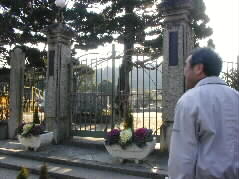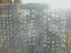 | 校門を入った所に大きな石碑、龍野小学校校歌が彫り込んであります。「鶏籠のみどりとこしへに 揖保の川原になくちどり・・・」 龍野の生んだ詩人三木露風作詞、山田耕筰作曲による校歌です。 この歌詞を見るとすぐにメロディーも出てきて、母と弟と3人で思わず大きな声で歌ってしまいました。 |  |