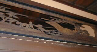 |  控えの間とお座敷の間の欄間です。揖保川で昔、活躍をしていた高瀬舟を曳いている図が精巧に彫られています。 | |