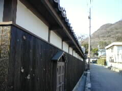 |  | 見学を終えて外へ出ました。武家屋敷の黒い塀が向こうの鶏籠山にマッチしています。 道路の右側は私達の母も姉弟も卒業をした小学校です。我が家から小学校の裏門まで3分、近いのでいつも裏門通学をしていました私達姉弟です。 |