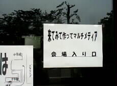 校舎の入り口に案内が貼ってあります。公開講座の名称は「来てみて作ってマルチメディア」4回シリーズです。 |