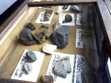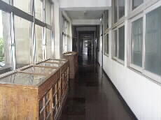 | 入り口でスリッパに履き替えて、会場の2階へ上がりました。今日は第2土曜日で学校は休日です。休日の中学校の廊下は何だかとても懐かしい匂いがします。窓際に並んだ資料箱には、九州各地の石の見本が入っていました。そんな石のかけらや手書きの表示からも、私はふるさとの中学校を思い出してしまいました。 | |