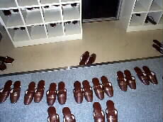 | しかし、さすが今の中学校です。廊下の突き当りには、立派な「コンピュータールーム」がありました。部屋に入るには専用のスリッパにまた履き替えます。 | ![]() |