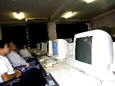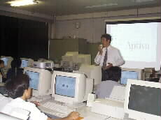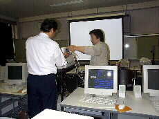 コンピュータールームには50台近くのパソコンが整然と並んでいます。大分大学の大岩教授(左)と山下教授(右)が私が話をする時に使用するパソコンとプロジェクターの準備をして下さっています。 |