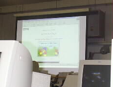 | 「我が家のホームページ」が大きくスクリーンに映し出されました。何だかうれしいような、恥ずかしいような気持ちです。ここにいろいろなページを映し出しながら、お話をしていきます。 | ![]() |