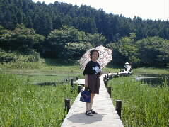 | 神楽女湖にはこんな木の橋がかけられていて、対岸に渡ることが出来ます。湖にはミズスマシなどが泳いでいます。 |  |