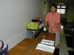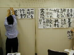 | 会場準備などは大分友の会のメンバーがお手伝いをしました。学園の生徒さんの作品を壁に貼って、来られた方に見ていただきます。 |  |