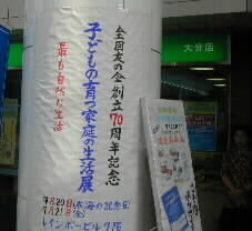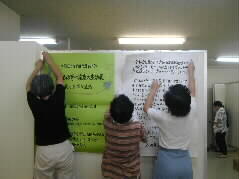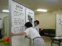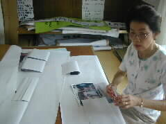 Today, we will drop in to Oita Group of Friends' house in the morning for last checking and will move to the site in the afternoon. Ms. Goto do the final touch on the panels. She painted many panels with Chinese ink together with Ms. Nyuu. |