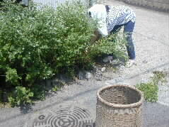 | Ms. Araki cuts down the apple mint growing around the house. She will arrange them at the site with a large basket brought by Ms. Ono. The white flower is in full bloom releasing fine aroma. | ![]() |