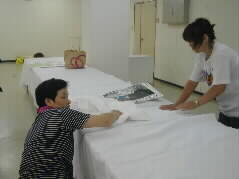 Brochures and questionnaires format have just arrived directly from a printing company. Ms. Aramaki (left) will be a receptionist today. Ms. Takahashi, the leader of actual arrangement, helps her. |