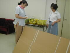 At a corner of the hall, Ms. Anan (left), the leader of children booth, and Ms. Matoba, the general leader of Oita Branch, make something up using large corrugated cartons.