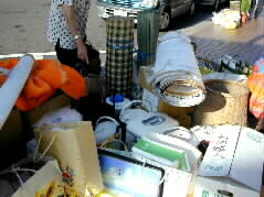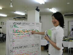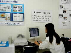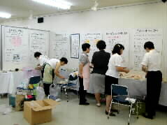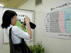 | Ms. Mika Ono arrived from COARA Co., Ltd. who kindly prepared a PC this time for the Exhibition. "Well, I can see that household hour has been decreasing in past 45 years." She took pictures with a digital camera and affixed seals on the board saying, "I got up at 6:30 this morning." The Exhibition was over at 4:00 p.m. as scheduled. Ono cleaned up the table and brought back the PC. Thank you very much for your kindness of renting the PC by free. Her report of today is here. | |