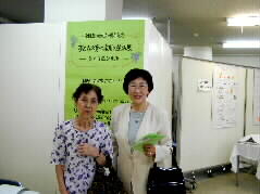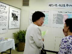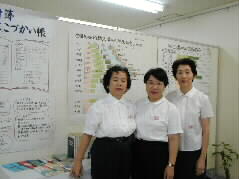 | Ms. Ogata (left, at left) introduced the Exhibition to Ms. Hiramatsu, wife of Governor of Oita Prefecture. Mrs. Hiramatsu looks through the Exhibition for an hour. She said she was very interested in learning actual numbers of household, in particular those of fifties who have college students. She was also impressed by knowing that there were as much as four Branches in Oita Prefecture. | |
