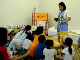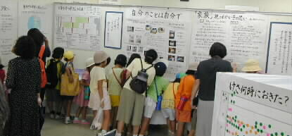 | Children are pleasantly looking around the panels and actual food displays saying, "They look very tasty" or "Are they real?" Children were interested in affixing the seals of "What time did you get up this morning?" or "Do you help your mother?" | |