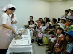 | Many children fill the hall. They are watching eagerly the demonstration of instant snack making. Some of the recipe will appear on the table in the summer vacation. | |