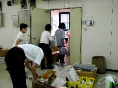| Sale staffs are busily preparing for the opening: from left, Arita (book seller), Yamada from Shapranir of Bangladesh, Ono (sale leader), Hirano, and Shiotsuki in charge of cooperative purchasing. | ![]() |