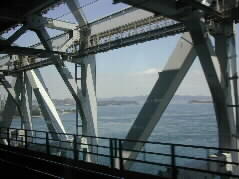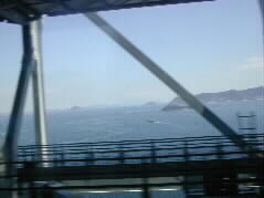 |     やがて、列車は瀬戸大橋を渡ります。ゴーゴーと音を立てて走る列車の下には海が見えます。 往路はこの上を走ったのかと思うと何だかとても不思議でした。 | |
