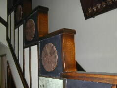 |  | 二階に上がる階段は、菊の紋章が付いています。これは、今から400年ほど前、宮中から菊の紋章を使う許可を得て、菊一醤油という屋号をつけた記念です。 |