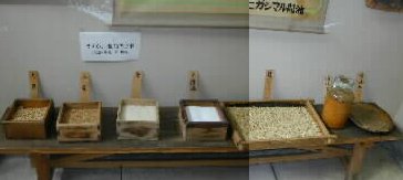 |  これは醤油の材料です。左から大豆、麦、米、塩、麹などです。龍野の醤油は薄口醤油で米を使うのが特徴です。 | |