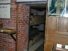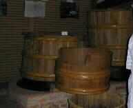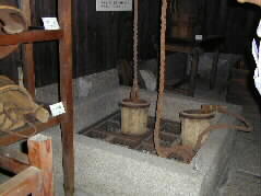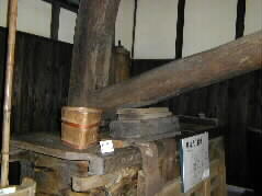 | 左は混ぜ合わせた大豆、小麦に麹菌を植え付けて醤油麹を作る麹室です。これに塩水を混ぜて大きな桶に入れ1年以上もかけて発行熟成させます。これを諸味といいます。この諸味に甘酒を加えて布袋に入れて絞りますと薄口醤油が出来ました。大きな樽やてこの原理を応用した圧搾機(右の写真)が展示してあります。 | |