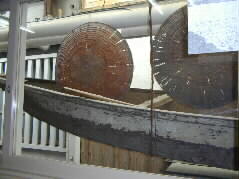 | 入館料10円也を払って資料館に入りますと、昔使われていた大きな醤油樽から作られた面白いベンチが置かれているロビーがあります。 |  |