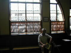 | 展示を見終えてロビーに戻ってきました。ロビーの窓はアールデコ調の丸い大きな窓になっています。その窓越しに、向かいの醤油工場の黒い瓦屋根と白い壁が美しく見えています。 これは私の原風景として醤油の香りとともに、何かにつけて思い出す懐かしい風景です。 |  |