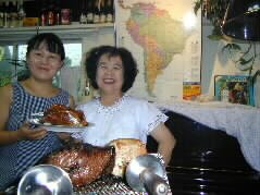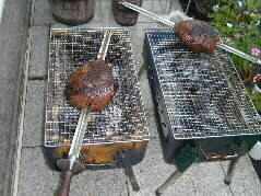 |    バーベキューコンロごと室内のテーブルに持ち込みます。厨房のオーブンで念入りに焼いてきた豚肉も サーベルに射してコンロの上へ、そして鶏の丸焼きはお皿の上です。 | |