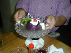 |  | デザートはとうもろこしのプデイングです。紫のコーンが珍しい。シュラスコでお腹がいっぱいといいながら、デザートはまたおいしく頂きました。 今夜は本当に素適なシュラスコパーテイでした。 あんまりお腹いっぱい頂いたので、帰りはテクテクと夜道をみんなで歩きました。 西の空では花火の音がポンポンとしていました。いよいよ今年の夏もおしまいだな、と思いながら歩きました。 |