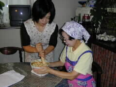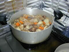 | まずは、大きなお鍋にいっぱいの「筑前煮」を作りました。下味をつけた鶏肉をさっと炒めたあと取り出して、お出し汁や調味料を入れて次にお野菜を煮ます。(ごぼう、ニンジン、サトイモ、干し椎茸、レンコン) 途中で鶏肉をお鍋に戻して丁寧に灰汁を取りながら、柔らかくなるまで煮含めます。 |  |