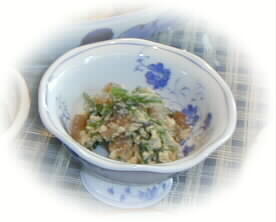 |  | とても香りの良い白和えの出来上がりです。でも、ニンジンも短冊に切って入れた方がきれいだったかな、と後で話しました。 |