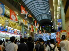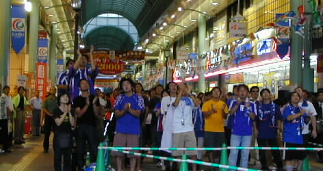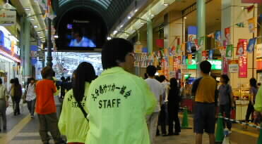 | 応援の人が次々と来ています。私はもう後は家に帰って応援をすることにしました。中央町商店街は、まだこんな画面もあって、それぞれにサッカーを映し出しているので人垣が出来ていました。 サッカー日本代表は、2-1で勝ちました。まだ点が入るかという積極的な攻めの日本チームでした。きっとマルチビジョン前は大いに盛り上がったことでしょう。スタッフの皆さん、集まって応援された皆さん、お疲れ様でした。今度はブラジル戦突破ですね。 | |