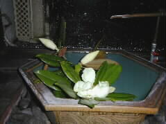 |  | 今日は「ゆふいん音楽祭運営委員会」に梅雨の大雨の中、夫と一緒に出席しました。 会場は湯布院のことこと屋、店休日にもかかわらず、解放して下さっています。水盤には梅雨の花、大きな泰山木の花が開いていました。 |