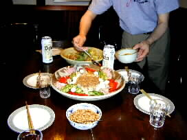 | 大きな大きなお皿には見事な中華風の前菜の出来上がり、そしてあっという間に作って下さった牛肉とレタスの蛎油炒めです。 |  |