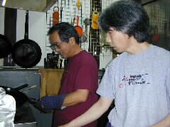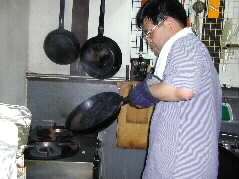 |  | さあ、いよいよチャーハンの競演です。まず一番手は夫です。愛用の中華鍋としゃもじを握って、まわりに調味料を集めて作ります。 隣では加藤さんが、トマトと卵の中華スープを作っています。 |