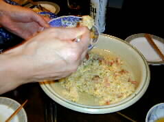 | 続いて加藤さんがチャーハン作り、さっさと手際はさすがです。いかにもチャーハンという味でとてもおいしかった。 三番手は、今日は見るだけ、食べるだけ!と言いながら座っていた佐藤さんもとうとうチャレンジ。塩加減が苦手ということで加藤さんに側についてもらって見てもらう。 とてもおいしいチャーハンが出来たと皆から好評ですっかり自信をつけた佐藤さんでした。 |  |