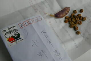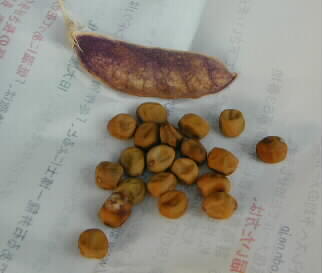 | Mr. Saga, one of my close friends of FOOD mailing list, describes on Tutamkahmen Pea in his homepage. By following his links, I found a homepage of Technical Course of Matsuida Municipal Nishi Junior High school that says "The Tutankhamen's Tomb Pea will be given to you on your request." I soon mailed the school and got 23 pieces of the pea. |