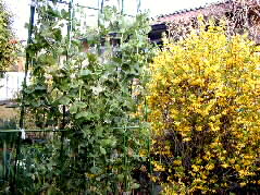| In my garden, Forsythia is in full bloom now, competing the height with Tutankhamen Pea. Both of them are now higher than me (151 cm, 5 ft.) | ![]() |