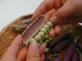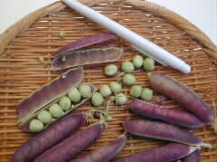 | The shell is violet, but the peas in it are green and sit in order. Today, I cropped 12 shells in all. The number of the pea was 64, meaning five peas in a shell in average. Until today, I have cropped 15 shells containing 73 peas in total. | |