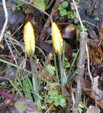 | 庭の隅で、クロッカスの花を見つけました。暖かい日に誘われて咲きかけて、今朝の寒さにとまどっているようですが、我が家の庭でクロッカスが咲き始めると、それはもう本当の春のしるしです。うれしいです。 |  |