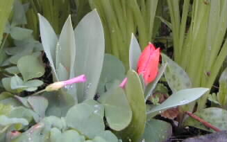 | まもなく色づいて来るな、と思っていましたら、水仙の株の陰で赤い小さなチューリップが咲いていました。 始めて植えたミニチューリップですが、色がとても鮮やかで可愛い花です。高さ10cmくらいです。 左に伸びているピンクの花は、オキザリスの花です。 |  |