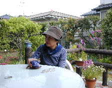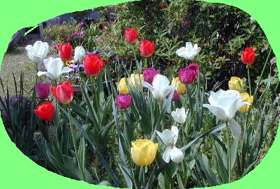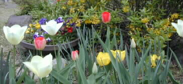 | 永い間私たちを楽しませてくれたチューリップもいよいよ盛りを過ぎました。もう暫くしたら、花を摘み取って、来年のためにまた土の中で眠ってもらいます。本当に永い間、ありがとう。 今日は、私の昔からのお友達が遊びにきて「きれいね」とチューリップを誉めてくれましたよ。 |  |