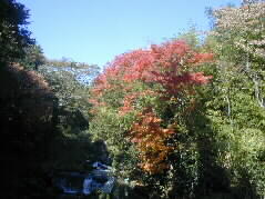 | 美しい紅葉を見つけました。谷川の水と青い空と、とってもきれいです。 |  |