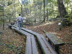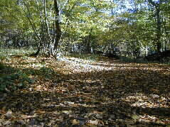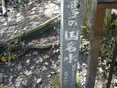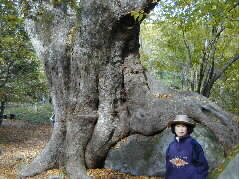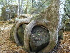 | 名水から流れる谷川に沿って散歩をしました。落ち葉が一面に散ってカサコソと気持ちの良い散策道です。 あたりには、たくさんの木が生えていて、大きな石を抱き込んだ珍しい木もありました。 |  |