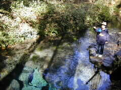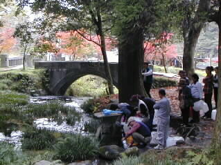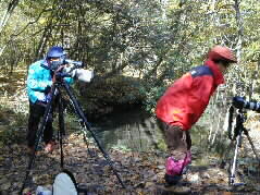|  | 写真同好会の皆さんでしょうか。大きなカメラを構えて谷川に焦点を合わせています。 |