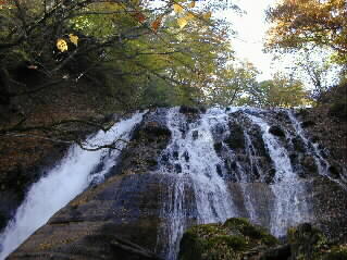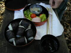 | 滝の水音を聞きながら、紅葉に囲まれてお弁当を食べました。 思い立って急いで握ってきたおにぎりも青空の下では大変おいしかったです。 |  |